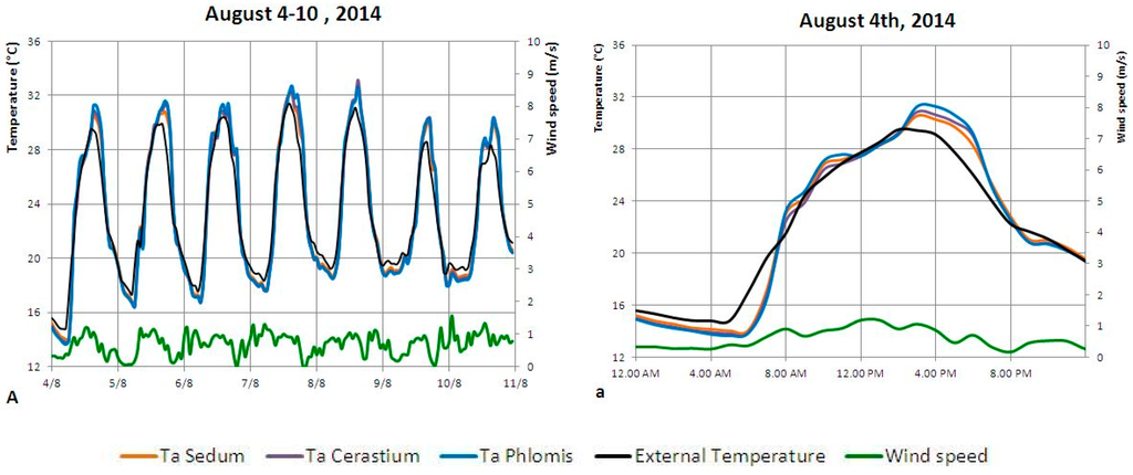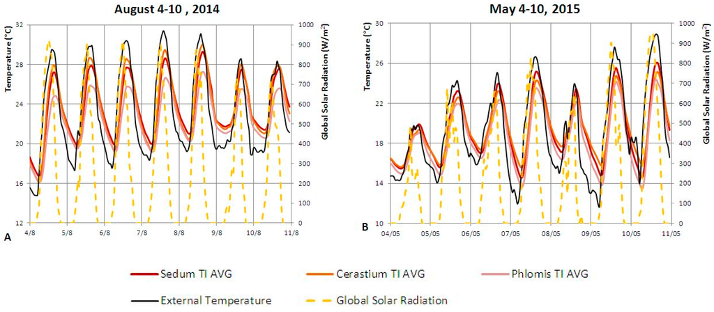Figure 5 shows graphs concerning the surface temperature of the three plant species (Ts), as a function of the main outside parameters (external temperature and global solar radiation) with respect to two sample weeks, from 4–11 August 2014 (Figure 5A,a), exemplifying summer of 2014, and from 4–11 May 2015 (Figure 5B,b) for spring 2015.