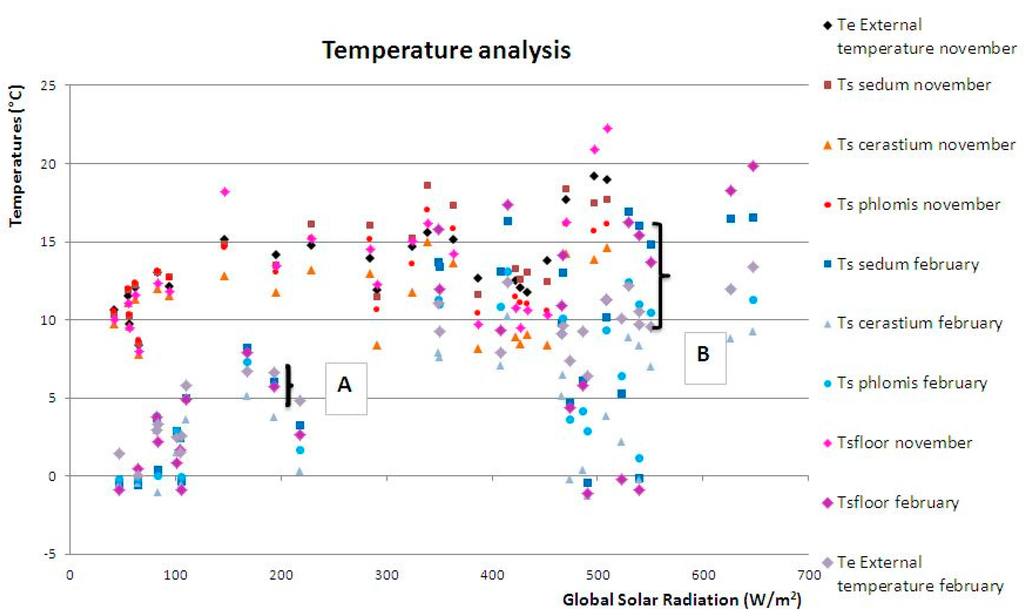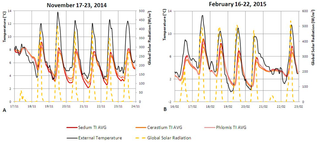 Figure 9 shows graphs related to the surface temperatures of the three plant species as a function of both the external temperature (Te) and the global solar radiation (I) with respect to two reference weeks, from 17–24 November 2014 (Figure 9A,a), representative of autumn 2014, and from 16–22 February 2015 (Figure 9B,b), representative of winter 2014–2015.