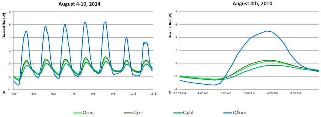 Analysis of summer heat flows: (A) sample week; (a) sample day.