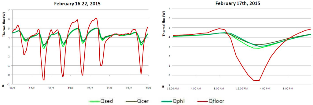 Instead, on semi-sunny or overcast days (22 February 2015, Figure 13A), heat flows are the same and involve the same heating energy consumption.
