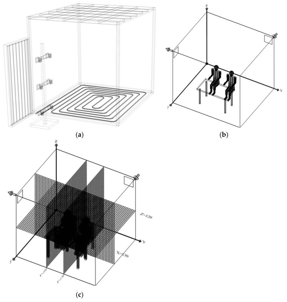 (a) Chamber, water ducts and collector scheme used in the building thermal response (BTR) numerical model; (b) occupants, interior bodies and chamber schemes used in the human thermal comfort (HTC) numerical model; (c) occupants, interior bodies and plans located at Y = 110 cm (Y22), Y = 170 cm (Y34), X = 130 cm (X23) and Z = 120 cm (Z23), used by the CFD numerical model in the work.