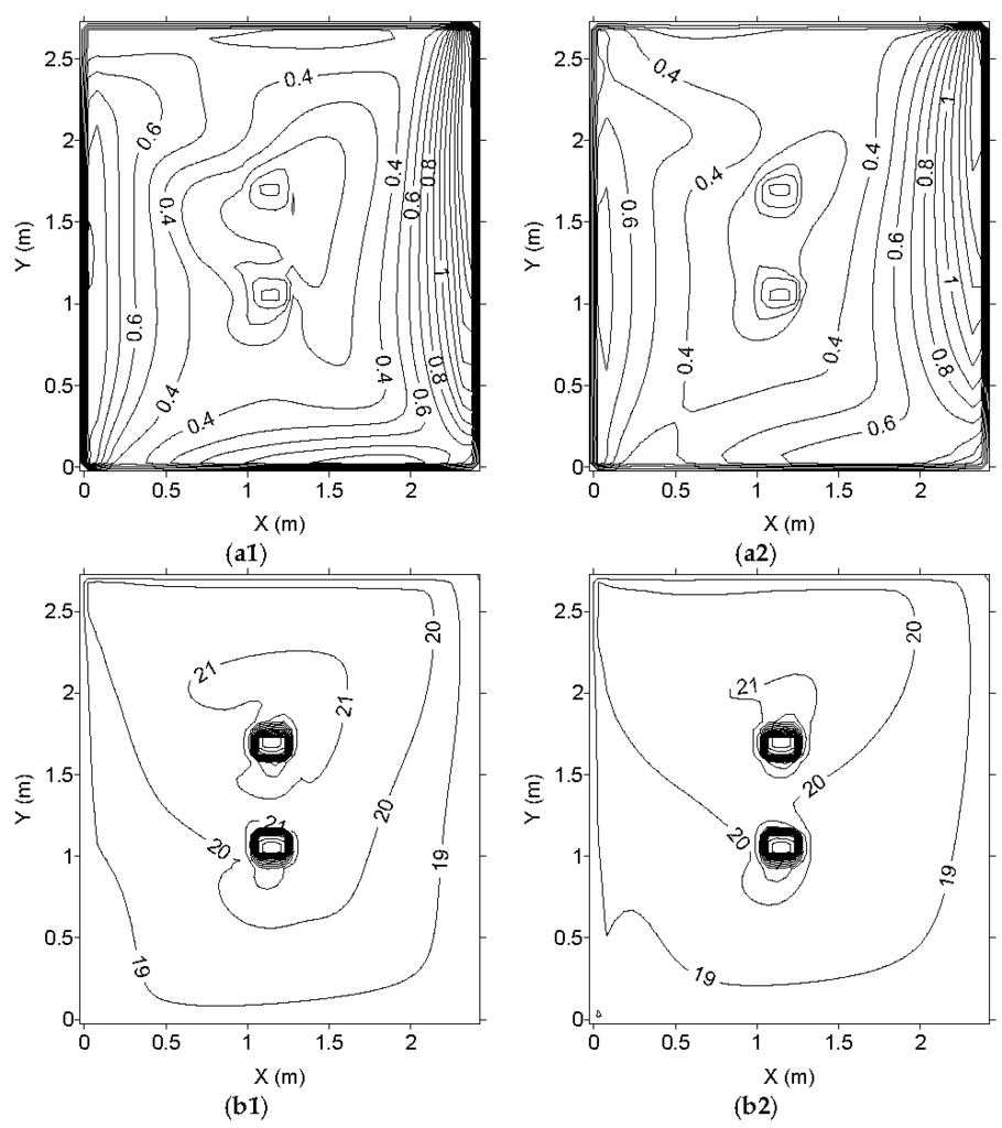 In [13], the CFD numerical model was used to evaluate air velocity and the air renovation rate in an experimental chamber, in moderate environments, in steady-state conditions and isothermal conditions, using a k-epsilon turbulence model. The air velocity fluctuations were measured, while the air velocity root mean square, the air turbulence intensity the draught risks, the air velocity fluctuation frequencies and the air velocity fluctuation equivalent frequencies were calculated. The experimental and numerical results, which show good agreement, were used to evaluate the thermal comfort, local thermal discomfort and air quality levels.