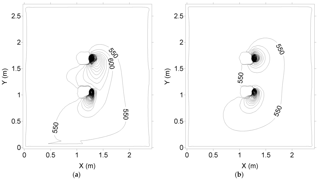 Finally, in order to evaluate the indoor air quality in the study presented in this work, the CO2 concentration, evaluated by the CFD numerical model, is used as an indicator of the indoor air quality. The CO2 concentration, used in this work, is released by the occupants. In this work, the recommendations of [25,26] are used. Some examples of the application of CO2 concentration can be seen, for example, in [27,28,29,30]. In [27], a study of CO2 dispersion in an auditorium is developed, and in [28], a work of indoor air quality in school buildings is presented; while in [29], the CO2 concentration in the airflow pattern in a residential building is used, and in [30], the CO2 concentration is used in the evaluation of the outdoor air ventilation rates.