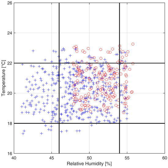 Monitored values of temperature and relative humidity in the RR. Red cross markers identify data collected during the museum opening hours, while blue circle markers identify data collected during closing hours.