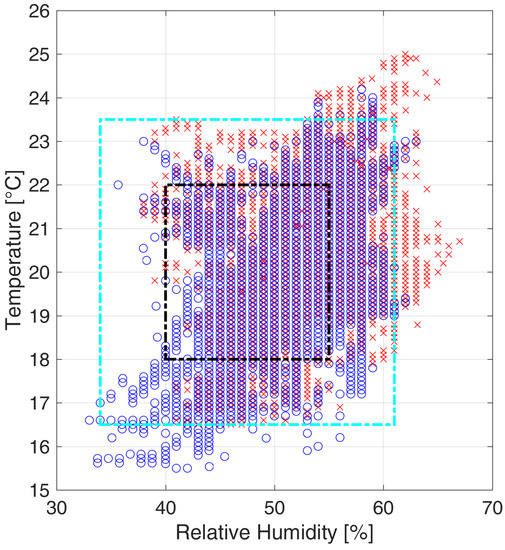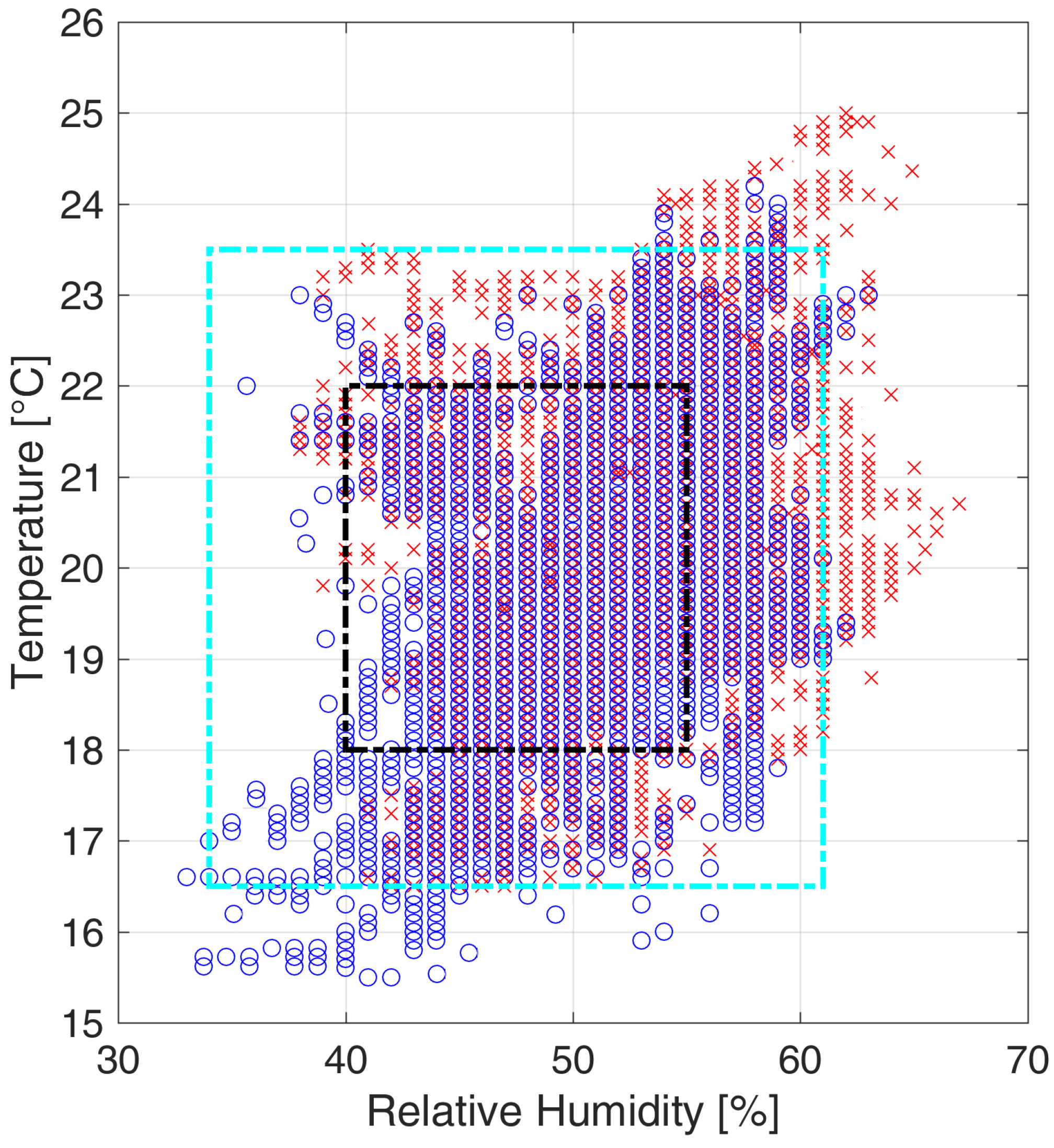The monitoring campaign showed that, even if an acceptable microclimate occurs most of the time, there is room for improvement of microclimate conditions. Figure 3 shows the mean values of temperature and relative humidity in RRs during the whole monitored period: each marker identifies an acquisition, recorded every 6 min (about 30,000 total data points). The red cross markers identify the data referring to the opening hours of the museum, while the blue circle markers identify the data related to the closing hours. The black rectangle identifies the optimal microclimate for preservation, while the larger cyan rectangle identifies the acceptable microclimate. It can be noted that the highest values of relative humidity and temperature are recorded at the opening hours of the exhibition (when the presence of visitors most influences internal microclimate): in fact, the mean values of temperature and relative humidity during the opening hours are, respectively, 21.0 °C and 51.2%, while the same values monitored during the closing hours are, respectively, 20.3 °C and 49.5%.