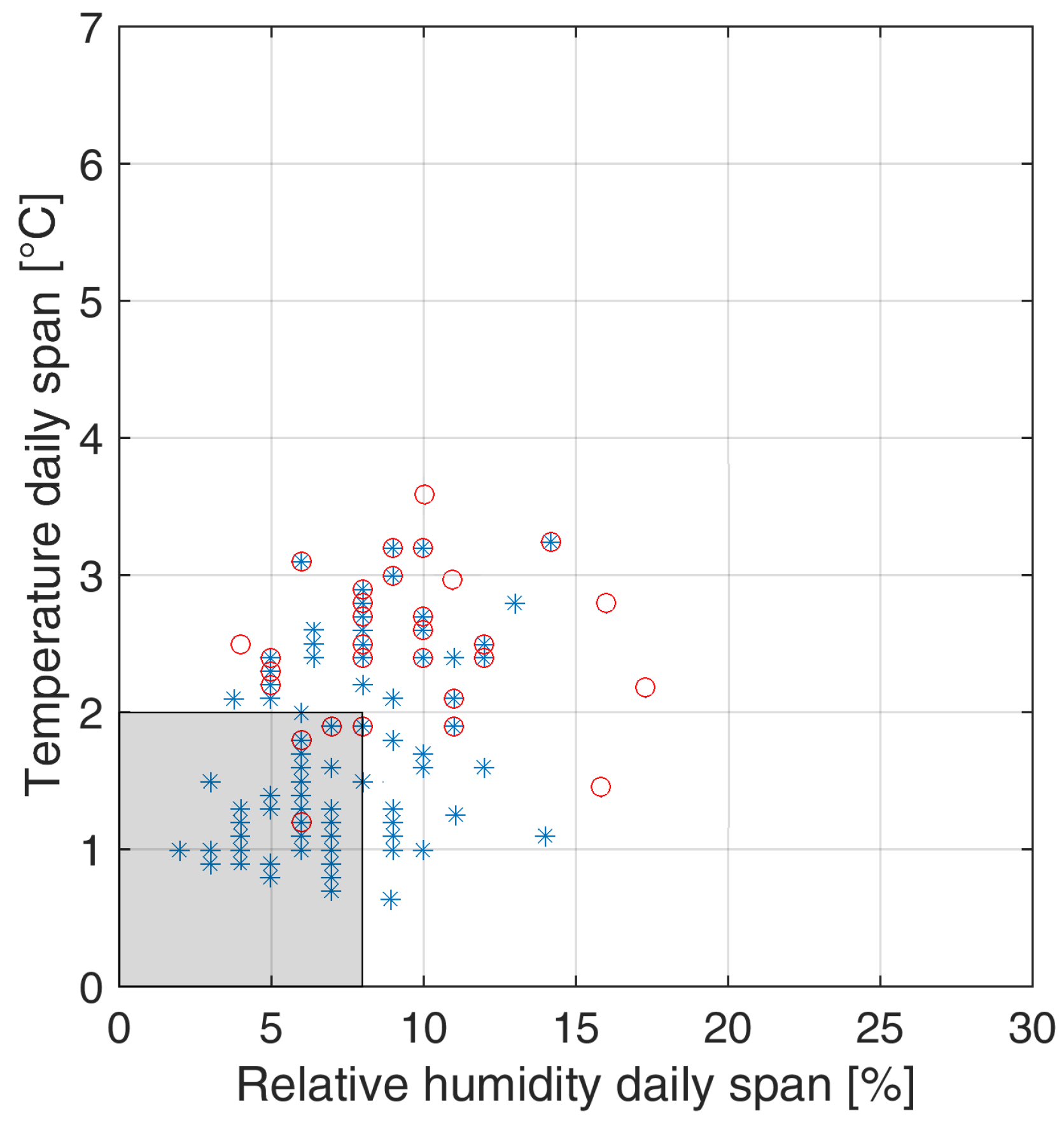 - daily variation of temperature and relative humidity: even if microclimate is maintained in suggested ranges, temperature and relative humidity can significantly vary on a daily basis and these cycles can cause artwork deterioration [38];