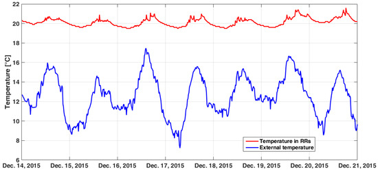 On the basis of the monitored data, we calculated the value of P.I. (65%), P.I.* (98%) and L.S.I. (100%). These values well highlight the suitability of the HVAC system in maintaining a microclimate that does not cause deterioration of the artworks and a correct design of the artificial lighting (mean illuminance value: 15 lx). In Figure 4, the daily span of temperature and relative humidity in the RRs is shown: the blue star markers identify the data referring to weekdays, while the red circle markers identify data referring to weekends. The gray area identifies the suggested maximum values of microclimate span, according to [38]. On the basis of these monitored data, we calculated the D.S.I., which is 48%. The D.S.I. value highlights a criticality in the RRs: the daily span of temperature and relative humidity is particularly high during weekends. This can be ascribed to the absence of dehumidification in the AHU components. In fact, chilled coils cannot be employed because, during winter, the heat pump can provide only hot water; however, especially during weekends, dehumidification coils are needed due to the high number of visitors. In any case, the high thermal inertia of the envelope is useful in reducing the temperature gap in the daily cycle, as the HVAC system is switched off during the night. The positive effect of the high mass walls is shown in Figure 5, where external and internal temperature are compared for a reference week (from 14 to 20 December). Internal temperature does not show relevant variation on a daily cycle.