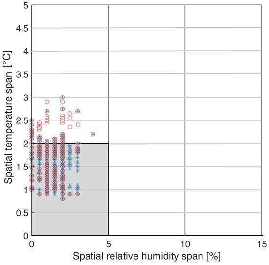 Representation of the spatial homogeneity of temperature and relative humidity. Red markers refer to data acquired during opening hours, blue markers identify data during closing hours. The gray area represents the suggested values for spatial homogeneity.