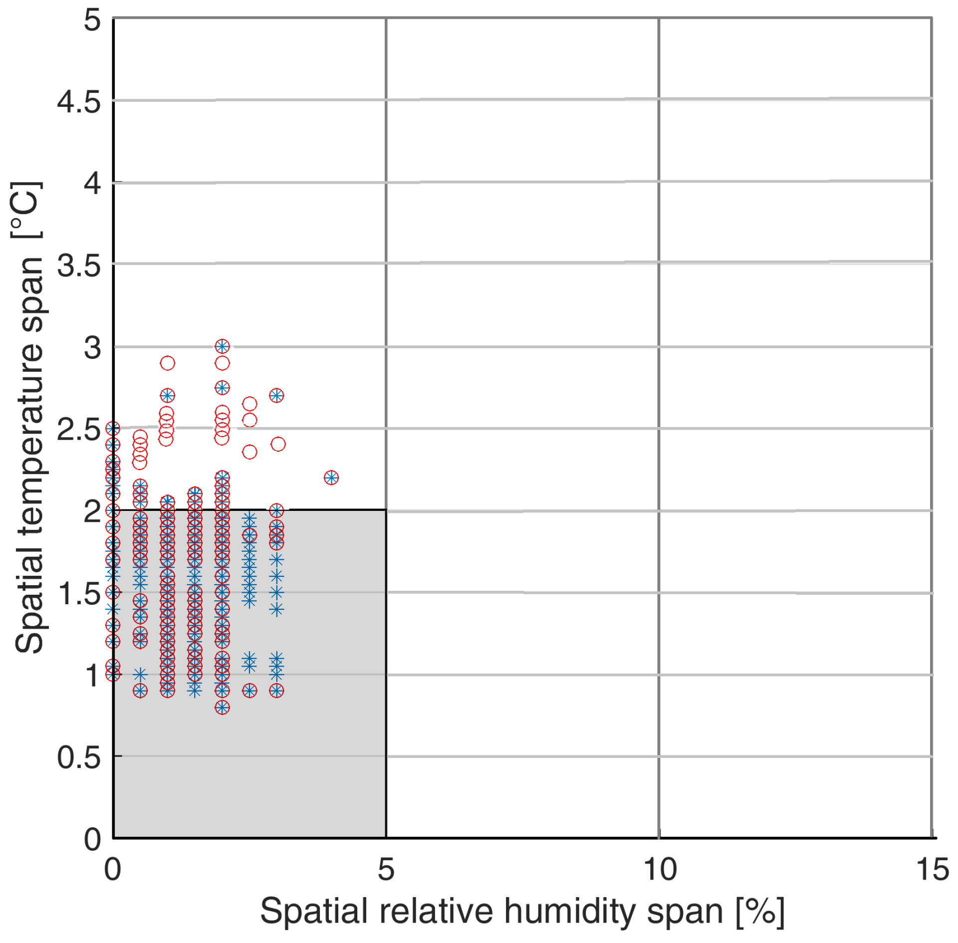 For the evaluation of the S.H.I., we referred to the perimeter of the RRs. We measured the maximum span of temperature and relative humidity along the perimeter of the rooms in December. The resulting value of S.H.I. is 74%. Figure 6 represents the spatial span, with the gray area representing the suggested values for spatial homogeneity as reported in [1]. Blue star markers identify the data referred to the closing hours of the museum, while red circle markers identify data referred to the opening hours. Figure 6 shows that unacceptable spatial temperature span occurs usually during the opening hours of the museum, while relative humidity can be considered homogeneous in space. It is worth noting that there is no inconsistency among the indexes values on relative humidity: this parameter sometimes exceeds the acceptable instantaneous limits and significantly changes on daily cycles, but instantaneously does not vary in space.