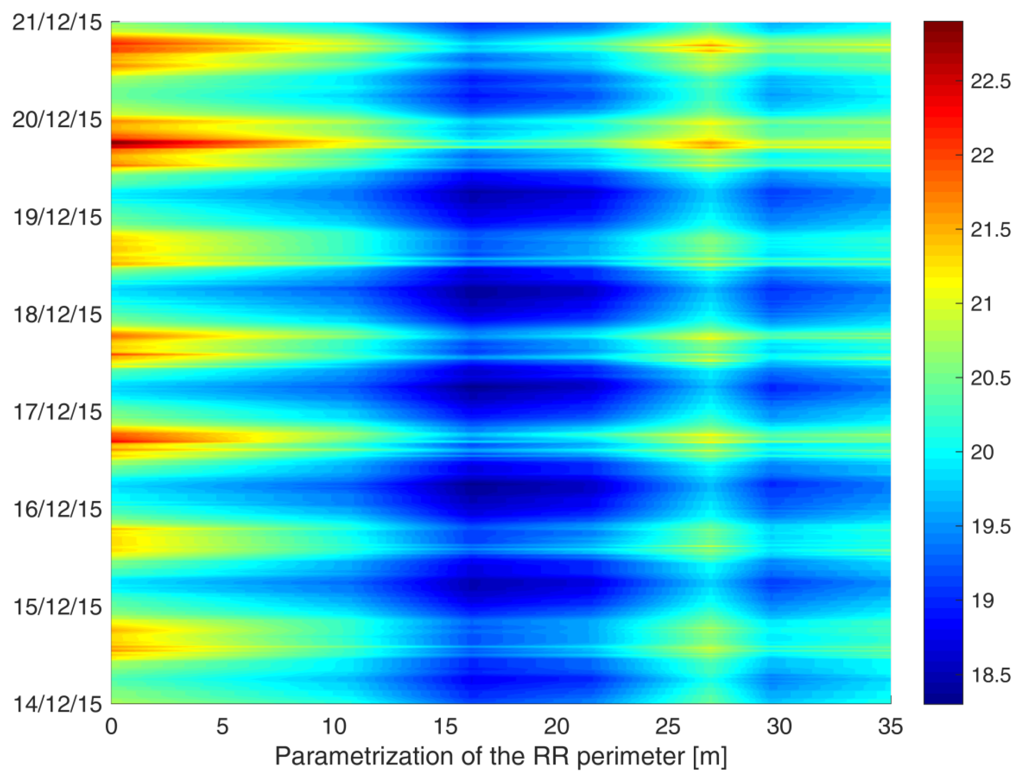 The presence of visitors strongly influences temperature and relative humidity in the halls: in particular, visitors are responsible for high relative humidity values on the opening hours, even if the monitoring campaign does not show relevant spatial variation of this parameter in the analyzed volume. On the contrary, temperature significantly varies along the perimeter. This effect is visible in Figure 7, displaying the internal temperature profile (monitored at a 1.5 m height) along the perimeter of the two rooms at the first floor, during a benchmark week (from 14 to 21 December). We report a parametrization of the perimeter of the two rooms with the blue line in Figure 8; the red rectangles represent the AHU dampers and the central black rectangles represent the fan coil units. In Figure 7, two higher-temperature areas are identified: the first is at x values between 0 and 10 m along the perimeter, and the second is between 25 and 30 m. The higher temperatures are due to internal heat gain caused by visitors that gather in the vicinity of the famous posters and artworks by Toulouse-Lautrec (for example, Reine de joie and La Passagere du 54), which attracted more visitors.