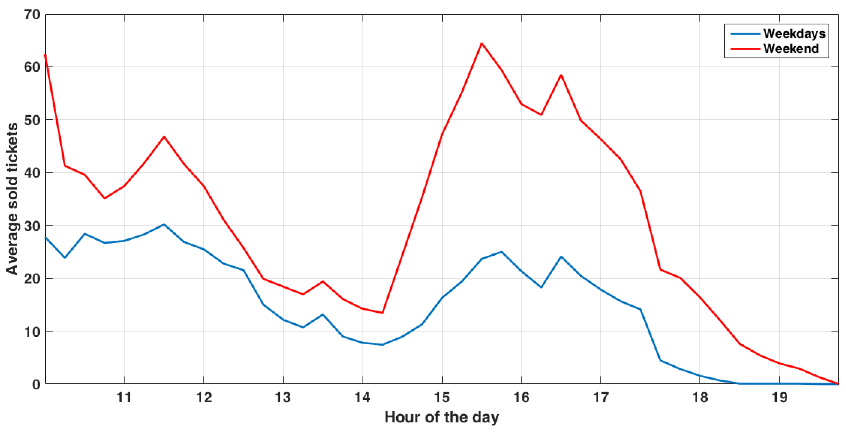 The typical heating due to visitors’ presence is clearly visible on a daily basis, and it is more marked during the afternoon hours. It is worth noticing that, during the weekend, temperatures along the whole perimeter were higher, revealing a higher number of visitors. These results, highlighted by the monitoring campaign, are confirmed by the hourly profile of sold tickets during the benchmark week, as shown in Figure 9, which shows the average number of sold tickets during the benchmark week, differentiating a typical weekday from a weekend.