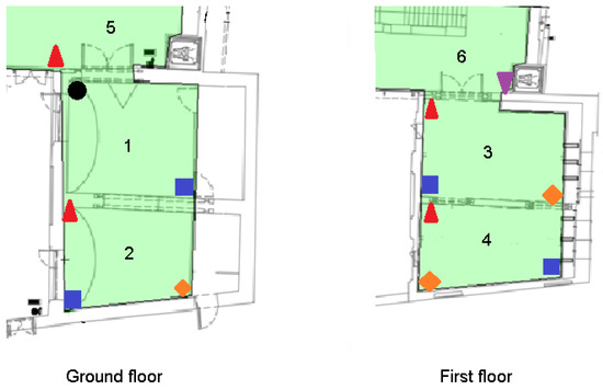 Sensor position in the four rooms. The round black marker identifies the QFA2001 sensor, the red triangle markers identify QAA24 sensors, the blue square markers identify 103AT-2 sensors (for the measure of temperature at 1.5 m and 2.5 m height), the orange diamond markers identify ZED-THL-M sensors, the inverted purple triangle marker identifies the 103AT-2 sensor for the measurement of temperature at 1.5 m height in the adjacent room.