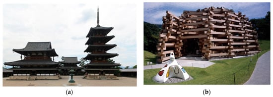 Japan, one of the most seismic areas in the world—since it is located between four different tectonic plates—is also periodically exposed to typhoons. Here, the need for heavy coverings emerges, not only to avoid the collapse of buildings due to storms, but also to reduce the effects of the earthquakes that periodically occurred in that area. Finally, Japan’s population, of 130 million inhabitants, lives in only 30% of a total land area of 380,000 km2. The rest of the country is covered by mountain forests. Hence, wood as a building material is a natural approach. The history of extreme natural events strongly influences the traditional construction techniques, as discussed by authors in the case of earthquakes [,] or storms [,] and as demonstrated by Japanese multistory pagodas [,,].