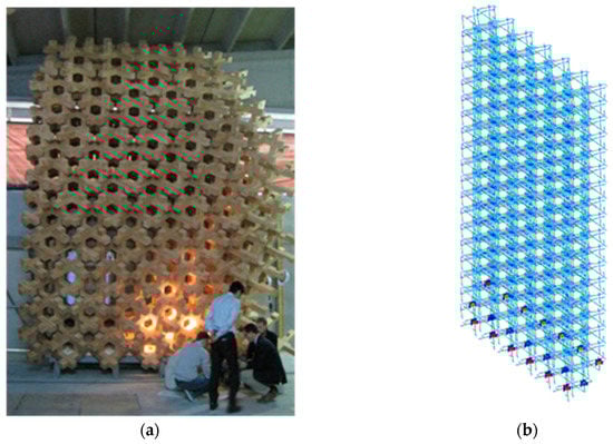 The structural model, with the feedback of the prototype, was done with the program PRO_SAP, modeling the highest A1.12 wall (almost 12 m high) with 18,070 beam elements obtained by dividing about 2000 elements into nine portions (i.e., in correspondence of the central wooden joints). The external constraints were 28 spherical hinges, placed in correspondence of the base of each element.