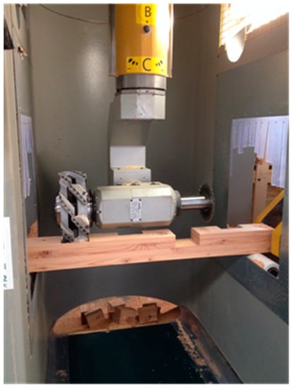 About 16,080 pieces were managed—instead of 15,900 initially hypothesized with the global modeling—to include imperfections and errors or tolerances. Roto-translations, playing on the mechanical arm, reached a threshold of about 160 sec per piece against 250 sec, which was firstly proposed as the default of the machine, based on the output of the mentioned Dietrich’s code. In doing so, it was possible to achieve the goal of 200 parts per day with a single machine. Figure 5 displays the used circular saw for cutting the wood pieces. Only in one phase is its diameter insufficient to cut the wood cross-section. That insufficiency slows down the first and the last stage by a few seconds but allows faster movements of the mechanical arm in all other stages, taking into account the lower orbit radius. The last working phase in the factory was the impregnation of the colorless, acrylic, water-based coating, with UV filters to reduce degradation and the yellowing of the wood exposed to sunlight. The main difficulty was fulfilling the client’s request for a colorless effect and, at the same time, UV protection.