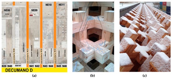 The proposed system is based on the Japanese technique named Merikomi. It consists of a sort of natural “pre-compression” method. The word is composed of two parts: Meri, which means “taking away” and refers to the joints made by wood, and Komi, meaning “include”, which refers to the mounting technique discussed below. This system exploits the favorable deformation perpendicular to the grain (which is usually the weak point of this anisotropic material), making it a highly effective node in the case of earthquakes. The concept of Kumimono (literally interlacing), or the intricate knots present in all Japanese temples (Figure 1), is also involved. The tradition of the Kumimono system is common to all East Asian countries []; firstly in China (where it is called Dougong) [] together with Korea and Vietnam, among others. A couple of examples of Kumimono solutions are shown in Figure 2. Recent cases include the Swiss Pavilion at Expo 2000 (Hannover, Germany) by Peter Zumthor and the Prostho Museum Research Center (Kasugai-shi, Japan) by Kengo Kuma and Associates. The latter, derived from the interlocking system of a traditional game (Chidori), posed analogous assembly problems.