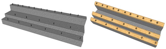 Once the protective caps were removed and after the bolts were cleaned using a screwdriver pulse, the basement was installed (Figure 7). The horizontality of the bases was corrected with larch elements to mitigate the different tolerances between the concrete and wood. Only those wooden elements on the basement were screwed to the foundation.