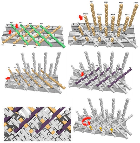 The construction stages followed a specific procedure (Figure 8): the first layer, made of two crossed elements, was mounted over the basement. After, the first series of uprights were installed on it and screwed at the bases. Then, another layer of horizontal elements, labeled WG1 and WG2 in Figure 8, were wedged in the uprights. Additional anchor elements were finally installed and rotated by 90° counter-clockwise, to allow for the interlocking of both underlying layers. This step was possible through the grooves in the pieces WG2 and WG3, which did not oppose the passage of the sharp edges of the vertical pieces.