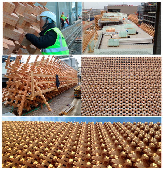 This article illustrates the production process, the structural calculations and the assembly phases of the wooden walls of the Japan Pavilion at Expo 2015 in Milan, designed by Atsushi Kitagawara Architects (AKA). The pavilion, one of the most popular construction of this international event, was built almost exclusively with precast interlocking. The production process and the assembly phases were optimized to construct the wooden walls (with a height of 4–12 m) in a short time frame and with a high level of quality. Out-of-plane rocking and other aspects of structural safety were considered, to ensure sufficient stability of the walls.