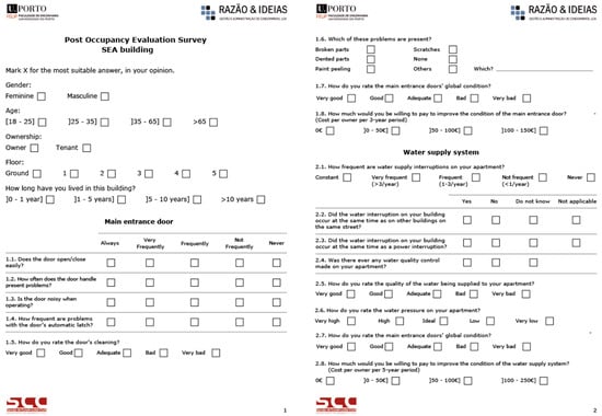 The fourth stage, crafting the enquiries, is the most crucial for the success of the evaluation. It is important to use a simple and non-technical communication, allowing the answers to be as objective and succinct as possible. In some cases, it is important to divide the information for one maintenance procedure into several simple questions, with two main objectives: to simplify the understanding of the question and to enable an unbiased opinion. In the data analysis stage these different responses may be combined to provide useful data for maintenance evaluation and planning. Best practices advise having multiple choice questions with five response options []. This allows the occupant to clearly distinguish the extremes and middle of the response scale. The questionnaire must also aim to allow the assessment of correlations between the occupants’ characteristics and their perceptions of the building. This demands the inclusion of questions regarding the occupants’ age, gender, period of stay, relative location on the building, or the ownership relation to the property. Finally, the technician must carefully consider the best method for conducting the enquiries to the occupants. This approach might be by mail or interview depending on the depth of the questionnaire and the characteristics of the occupants.
