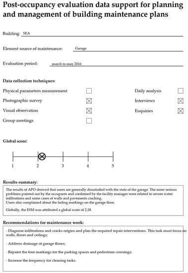 The final results are organized in technical maintenance sheets, as shown in Figure 3. These sheets will contain: the addressed ESM, the period of evaluation, the applied evaluation methods, a brief presentation of results and finally, a set of advice to be considered by the facility manager on the planning and improvement of the building’s maintenance plan.