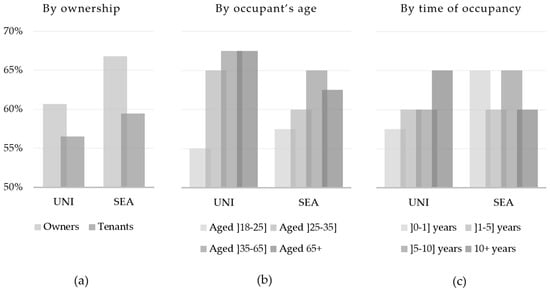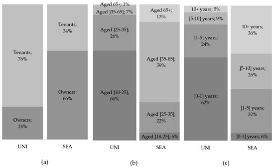 The occupancy patterns are deeply divergent between both sets of buildings, which provides an ideal set of circumstances to evaluate the influence of the occupant’s profile in its use and perception of the built environment. The first set, consisting of nine buildings, to be designated from here forward as UNI, is located next to a university campus. Its location leads to a very specific occupancy pattern, as the buildings are mostly occupied by college student tenants. The second set, consisting of 11 buildings, to be designated as SEA, is located on the seaside, and is mostly occupied by traditional families. The characteristics of the buildings’ occupants are further detailed in Figure 4, with regard to three main features: whether the occupant owns or leases the apartment, the occupant’s age and the occupant’s time of occupancy in the set apartment.