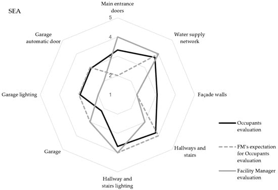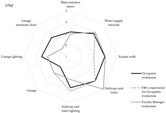 The facility manager’s main concerns were the garage’s automatic doors in UNI and the main entrance doors and facade walls in SEA. Occupants, however, contradicted this perception. UNI occupants rated the garage’s automatic doors as above adequate and the SEA occupants rated the main entrance doors and the facade walls as above adequate.