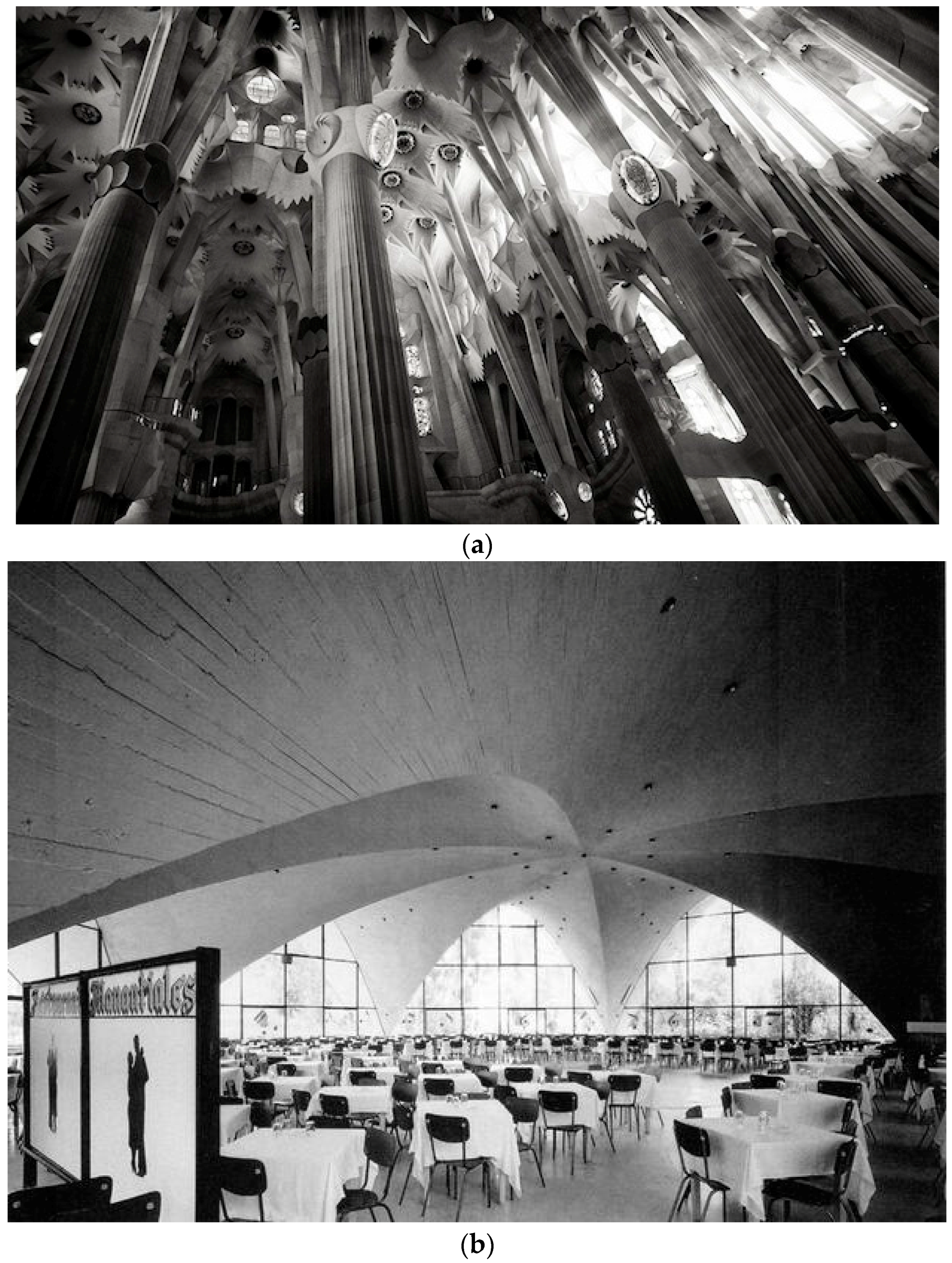 (a) The interior of the basilica at La Sagrada Famiglia. Designed by Antoni Gaudi. © Cyril Bays. (b) The interior of Los Manantiales Restaurant, Mexico. Designed by Felix Candela. © www.rkett.com. (c) An interior view of the Manheim Multihalle. Designed by Frei Otto.