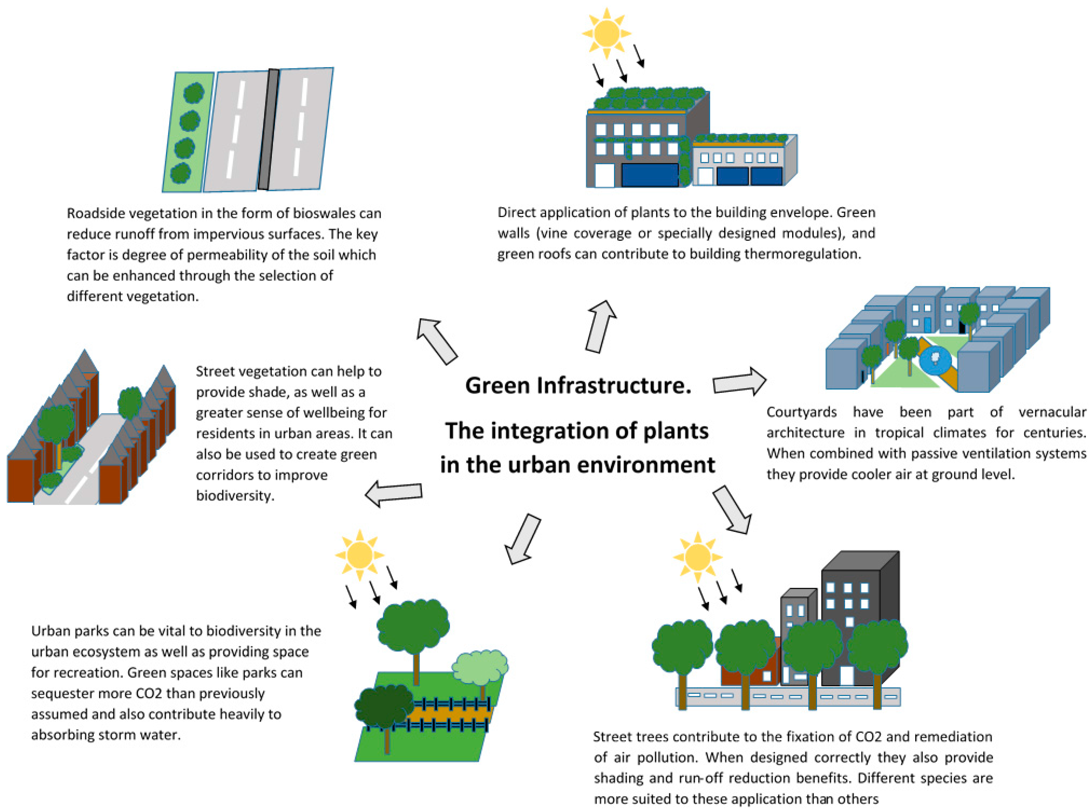 Plant science has traditionally sought to understand the biology of plants and to exploit this through agriculture and horticulture. Increasingly, however, the expertise of plant scientists is also likely to be important for the growing of plants in new environments and for design inspiration. Plants can therefore provide both direct and indirect solutions, the latter through biomimicry. Plants can help to provide thermal comfort, energy savings, storm water mitigation or carbon sequestration in urban environments. A better knowledge of how green spaces interact with the built environment, and how people utilise them is vital to maximising the health and wellbeing of those living in the city. The diversity, and longevity of functional ecosystems within a city which require little maintenance and provide a greater range of ecosystem services will be vital to the success of urban greening schemes. In Europe and the US, the integration of plants into urban environments is being led by urban planners and policy makers where there is a strong recognition of the importance of green space [2,3,4]. Thus far, the consideration of how to incorporate plants into many urban settings on a large scale could be characterised as “green is good”, with less consideration given to precisely what kind of green is best. Ecological research has had a significant impact on the use of plants in the urban environment for example in the promotion of biodiversity [5,6,7,8] and in terms of biological suitability [9]. Meanwhile, there is a need for a greater contribution from plant scientists in the evaluation of which plant should be used for each given function and how plants respond biologically, to the challenges that urban environments pose such as increased heat, highly transient drought and flooding events and elevated CO2.