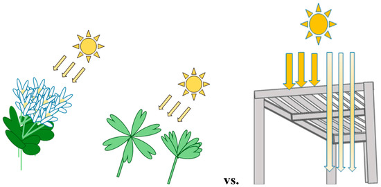 Leaf angle and orientation affect the light which falls on the surface of the leaf, and how much passes to the lower leaves or the ground below. There is a similarity between the consideration of leaf angle and orientation in a plant and the inclusion of differently shaped and oriented windows in buildings. For example, a deep splayed reveal with the window on the inner side results in a reduction in penetration of summer sun and a heat gain in winter when the angle of the sun is lower. A tall narrow window and a short wide window have very different light penetration and thermodynamic properties. Skylights for example, result in a much higher light penetration per unit area than windows placed on the outside of the building. The arrangement of window shapes and positions bears resemblance to canopy architecture, in that whole plant architecture determines light interception [42]. Modern plant science seeks to produce crops with architectures that intercept more light to drive higher rates of photosynthesis and yield [43,44]. The design principles that are used for a crop canopy to increase or decrease light interception can be thought of as analogous to skylight or roof window design in architecture where the aim is also to either increase or decrease the amount of light which falls into the spaces below.