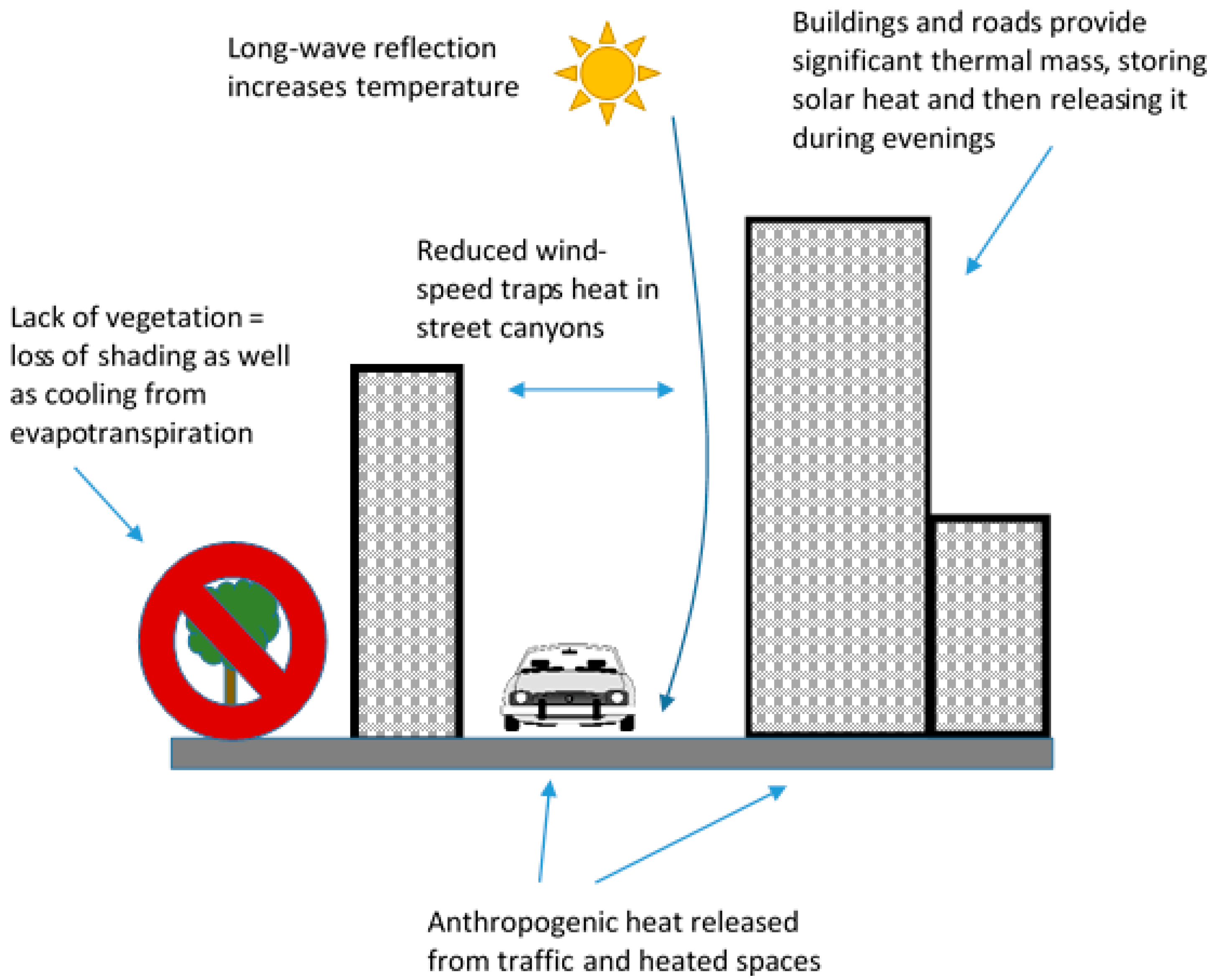 Contributions to Urban Heat Island (UHI) from multiple sources, including a lack of vegetative cover and reduced evapotranspiration.