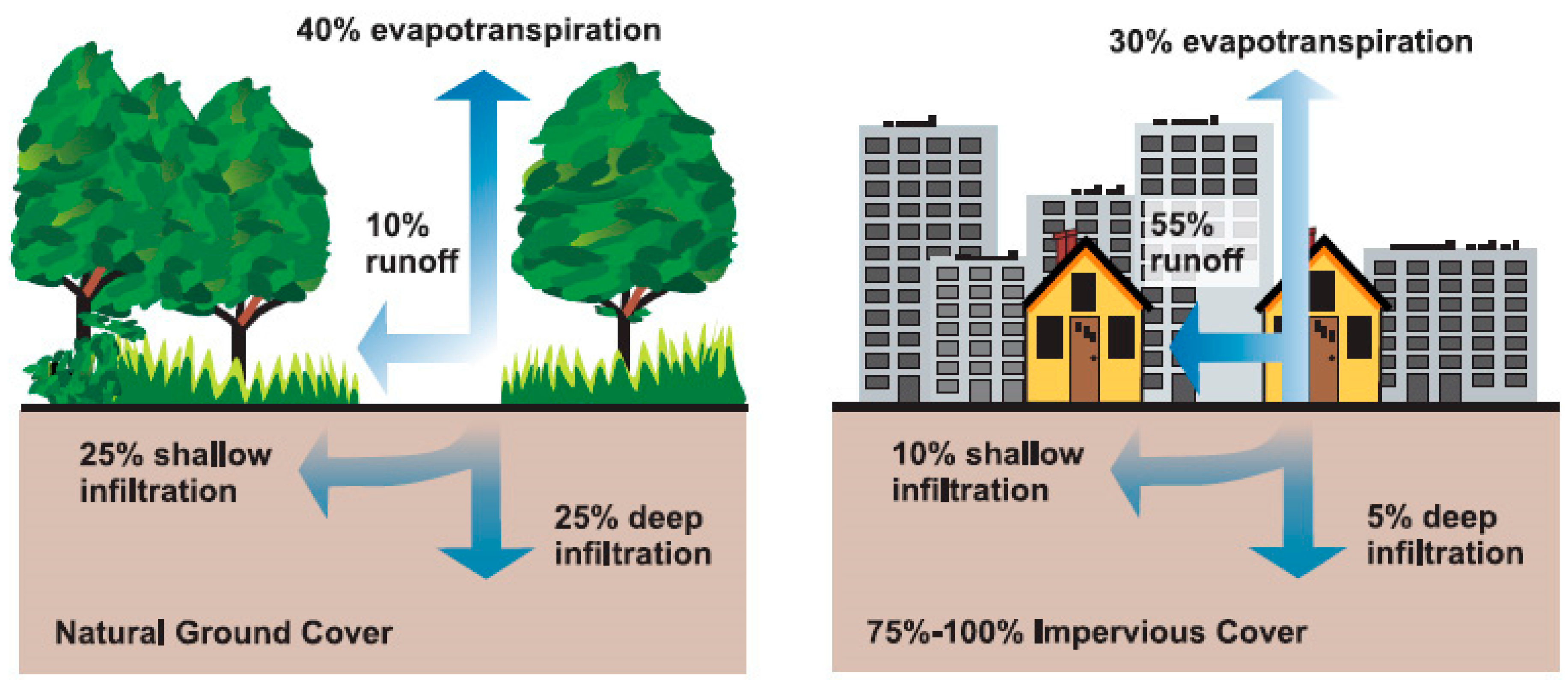 Water cycle comparison of urban and natural landscapes. Reproduced from US Environmental Protection Agency Doc. No: EPA 841-F-03-003 [99].