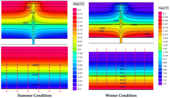 Figure 4, in case of summer, the heat flows from outside towards inside through the route of metal fasteners. In addition, the temperature around the fastener is seen to be higher than the rest of the assembly. On the other hand, in case of “no fasteners”, the heat flow and the temperature distribution is uniform throughout the assembly. This figure clearly indicates the mechanism of heat flow through an assembly with metal fasteners acting as the major career of heat flow and also provides an evident justification that why there is a sudden increase in heat loss going from cases of “No Fasteners” to the Field zone with fasteners. For in-depth understanding, isotherms for each case analyzed are provided in