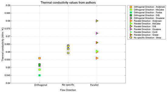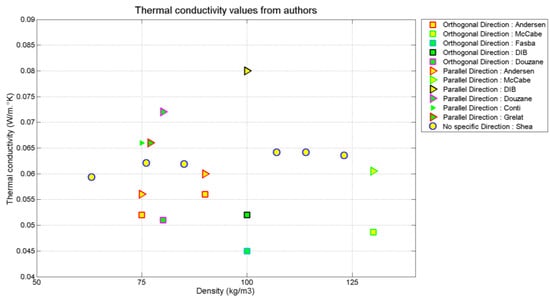 Some immediate conclusions can be brought out; considering a given thermal flow direction, these observations show a rise in thermal conductivity when the density is increasing. When the direction of the heat flow is considered, the measured conductivity values show a decrease when the direction is varying from parallel to perpendicular. The case observed by Shea (no specific direction—represented by a blue circle in Figure 1) can be considered as a mix of parallel and perpendicular fiber directions. Consequently, it was chosen to display the values along the x-axis in Figure 2, between the parallel and perpendicular directions.