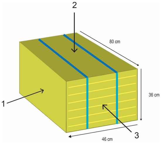 The standard dimensions of straw bales used in Belgian buildings were used; 36 cm × 46 cm × 80 cm, as presented in Figure 4. The length is usually around 80 cm, but it can be set to another value, ranging from 36 cm to 120 cm or 150 cm, if necessary. When the length is too small, more handling is needed; when it is too long, there may be problems of cohesion and the bale may be too heavy to handle easily.