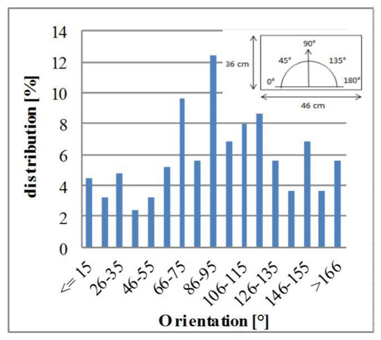 If many values are given for perpendicular or parallel heat flow directions, not a lot of information can be found on how the fibers are truly oriented in the straw bales. Figure 3 shows the average results obtained when analyzing five slices of a single straw bale. This visual assessment accounted for each slice; 50 fibers of a minimum 8 cm long.