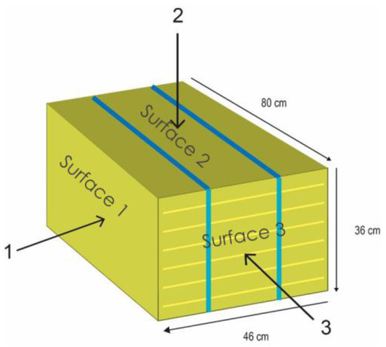 ‘Surface 1’ (36 cm × 80 cm) is thus defined to be the surface of the bale seen when the bale is laid ‘flat’ and where the heat flow will follow direction 1. ‘Surface 2’ (46 cm × 80 cm) is the surface that can be seen when the bale is laid ‘on-edge’ and where the heat flow will follow direction 2. ‘Surface 3’ (36 cm × 46 cm) is the ‘header’ of the straw bale, which can be seen if the bale is laid with its long side perpendicular to the wall surface, and where the heat flow follows direction 3. Figure 5 illustrates these definitions.