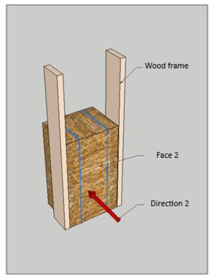 Figure 9a,b present a variant in which the straw bales are laid on surface 2. This orientation is not common on building sites. This theoretical orientation of straw bales in the wall is presented because it may have an interesting thermal performance, as the results on thermal conductivity measurements will show. In this case, the straw bales are laid on surface 2 and the heat flow follows direction 3. The Figure 9a shows that, without reducing the length of the straw bales, the wall would be 80 cm thick. The Figure 9b shows a more realistic proposal where the straw bales are produced (or adapted) to obtain a wall about 36 cm thick. The minimum spacing between the vertical posts of a load bearing structure is then 36 cm. Specific attention must be paid in these two cases if a rendering or plastering is to be applied on the wall because surface 3 may not be a good substrate (bad mechanical cling).