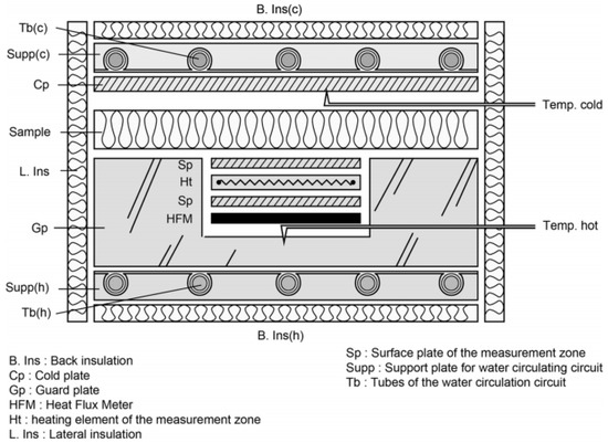 The specific Guarded Hot Plate (GHP) developed in this research and detailed in Dubois [3] was placed in an environment at 10 °C (hot plate at 15 °C, cold plate at 5 °C), while the test samples were stored in an environment at 23 °C and 50% RH before measuring, according to EN ISO 10456. The guarded hot plate technique is a stationary method that requires thermal equilibrium and thus a significant measurement time. Its principle is to reproduce the uniform, unidirectional, and constant thermal flux density existing through an infinite, homogeneous, slab-shaped specimen caught between two infinite isothermal planes. The analyzed specimen is sandwiched between a heated hot plate maintained at temperature Tb(h) and a cold plate maintained at a lower temperature Tb(c) as presented on Figure 10. The heat dissipated in the hot plate would travel to the cold plate through the sample but also backwards and laterally on the edges of the hot plate. Back and lateral ‘guard zones’ are then necessary to neutralize these leaks.