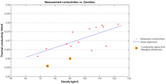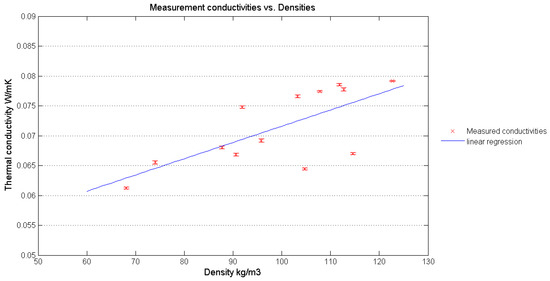 R2, the coefficient of correlation, and r, the Pearson coefficient of the model, were respectively 0.48 and 0.69. These statistical results indicate with 5% uncertainty that the proposed regression model is reliable and that the model explains 48% of the total variance of thermal conductivities. In order to go further, a variance analysis was applied to the model and its three coefficients; namely, the constant, density, and thickness coefficients. The variance analysis yielded the following results; the measured effect for the density is significant while no effect for the thickness could be found. Consequently, a simple linear regression is applied to the measured conductivity, considering the density only. Again, this analysis includes all the 65 measurements. The resulting model and its regression equation are displayed in the Figure 12.