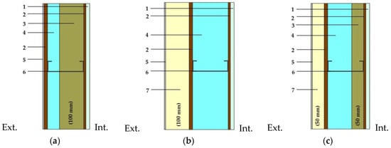 Figure 2 displays the temperatures distribution along the cross-section of the three wall types shown in Figure 1. In Figure 2 boundary conditions were set for external and internal environment. An external temperature was set equal to 0 °C and 20 °C for the internal temperature. The convective surface heat transfer coefficient was set according to EN ISO 6946 [] for a horizontal heat flow, namely he = 25 W·m−2·K−1 and hi = 7.69 W·m−2·K−1 for the external and internal environment, respectively.
