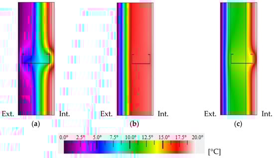 Temperature distribution in LSF facade walls: (a) cold frame construction (U = 0.5316 W·m−2·K−1); (b) warm frame construction (U = 0.2951 W·m−2·K−1); and (c) hybrid frame construction (U = 0.3581 W·m−2·K−1).