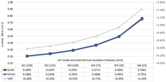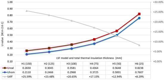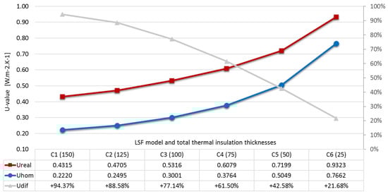 Table 4 presents an overview of the results obtained in this work for the types of LSF construction. In addition to the Ureal and the Uhom values of the walls, the difference between both is also presented as a percentage.