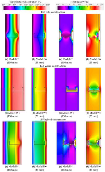 The previous considerations, related to the influence of the steel studs in the thermal insulation effectiveness in the different constructive types are supported by Figure 8 which illustrates the flux magnitude and temperature distributions for the models with the lower and higher thickness of thermal insulation within each construction type, namely, with 25 mm and 150 mm of insulation.