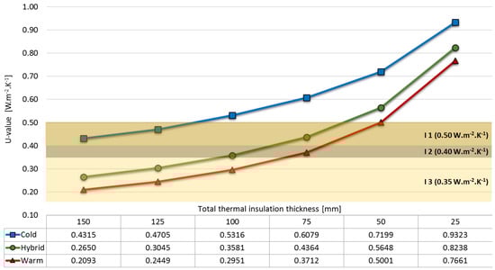 In cold construction (Figure 2a), all of the thermal insulation, generally flexible (acquired in rolls), is placed inside the wall air cavity, within the thickness of the steel frame, being pierced along its thickness by it. This type of construction is not recommended for cold climates because of its poor thermal and hygrothermal performance when compared to the other types of construction, as it can be seen in Figure 2, comparing the U-values of the three different walls with the same amount of thermal insulation.