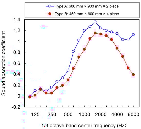 The sound absorption panel used in the experiment was made of two types of polyester nonwoven fabrics, Type A and Type B, which are shown in Figure 1. The sound absorption coefficient was measured by JIS A 1409 [] and has the characteristics shown in Figure 2. However, this sound absorption coefficient is measured with a 1.08 m square of test specimen. Therefore, the sound absorption coefficients are above 1.0 by area effect. Both types have peaks in the 1600 Hz band. Type A is a paper with a honeycomb structure that is sandwiched between polyester nonwoven fabrics on both sides and Type B is a paper with perforated cardboard on the surfaces. The sizes of the sound absorption panels used in the experiment are shown in Table 1.