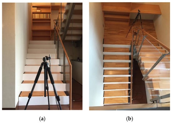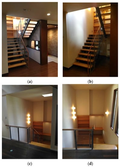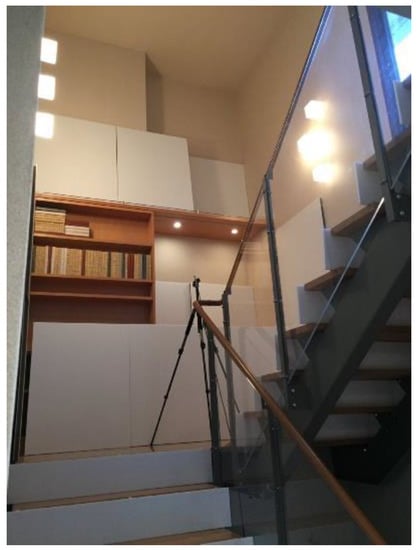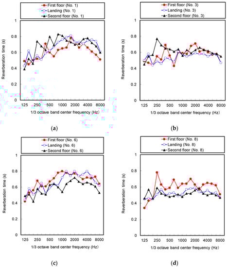 Studies on residential buildings have been reported by Díaz et al. They measured the reverberation times of 11,687 rooms targeting closed-space bedrooms, and living rooms []. Watanabe et al. and Hanyu et al. conducted auditory experiments on living room spaces and studied the impact of change in the average sound absorption coefficient on things such as “sense of luxury” and “preferences” [,]. However, in all the studies, the reports are targeted on the living room space and there are very few reports on spaces such as staircase and stairwells.