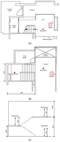 Plan of the stairwell used in the experiment. (a) First floor plan, sound source position and measurement position; (b) Second floor plan, sound source position and measurement position. (c) Sectional view of stairwell and microphone height.