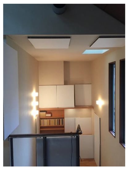 In educational institutions such as schools—from an educational perspective—it is necessary to have moderate silence and voice communication without any hindrance. Therefore, in each country, standards and regulations for indoor noise and the soundproofing efficiency between rooms, and inside or outside of rooms [,,,,,,], have been established, and these educational facilities, such as schools, are actively being studied. Tang et al. measured the reverberation times and noise levels in the classrooms of primary and middle schools of Hong Kong, and derived the relationship between the reverberation times and speech transmission indices for speech transmission design [,]. Zannin et al. measured the reverberation times and indoor-outdoor sound insulation efficiency in the public school facilities of Brazil and studied the actual conditions of the acoustic environment quality []. Chiang et al. conducted noise measurements and a questionnaire survey in open-plan primary schools of Taiwan and they also studied the action conditions of the acoustic environment quality []. Both cases have reported that the target acoustic environment for study is inadequate. Ruggiero et al. determined the distribution of the sound pressure level in school music rooms from a simulation that used general-purpose software, and studied the installation position of the sound absorption panel and verified the effect on the reverberation time []. Nocera et al. investigated the acoustic environment quality of a lecture venue where a tensile membrane structure was used and proposed an improvement method by simulation []. Shih et al. obtained room acoustic characteristics of various design conditions by simulation using general purpose software for a container house with a low acoustic environment quality []. However, these studies did not mention the residential space. Additionally, there are few reports on the acoustic environment for residential spaces and useful methods to improve it.