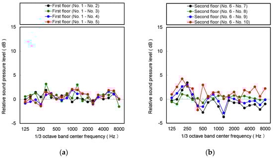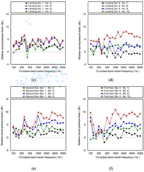 In the case of Figure 8a,b, since the measurement point and the sound source position were located nearby, the direct sound became dominant, and in either case, at all the frequencies, there was almost no sound pressure level difference due to the effect of the difference in installation area and installation positions. In the case of Figure 8c,d—the intermediate floor, that is the landing—where the sound source was located, in Figure 8c, on the first floor, though there were variations based on the frequency band, there was almost no difference due to the panel placement position, namely on the landing walls and riser, given by No. 2 and No. 3. From this, it can be seen that it is more effective to install the sound absorption panel on the riser with a smaller installation area than installing the sound absorption panel on the landing walls. Furthermore, the sound pressure level difference did not change substantially regardless of the presence or absence of the sound absorption panel on the staircase space of the walls of the second floor and ceiling, given by No. 4 and No. 5. From this, it can be seen that there is little effect even if the sound absorption panel is installed on the wall and the ceiling of the second floor. When the sound source was located on the second floor, as given by Figure 8d, the sound pressure level difference between No. 8 and No. 9 was almost the same in most frequency bands, and there was almost no change in No. 7. From these results, it can be said that the effect is small in the landing area when the sound source is located on the second floor, or when the sound-absorbing panel is installed on the riser. In addition, in the case of No. 10, since the sound pressure level difference increased in comparison with No. 8 and No. 9, it can be said that by installing the sound absorption panel on the staircase wall of the second floor and ceiling, there was some effect on the sound pressure level reduction. In the case of Figure 8e,f in which the sound source position and the measuring points were different on the upper and lower floors, the trend differed from that of Figure 8c,d, where regardless of the installation position of the sound absorption panel in both cases, the sound pressure level difference also increased with the increase in the sound-absorbing effect.